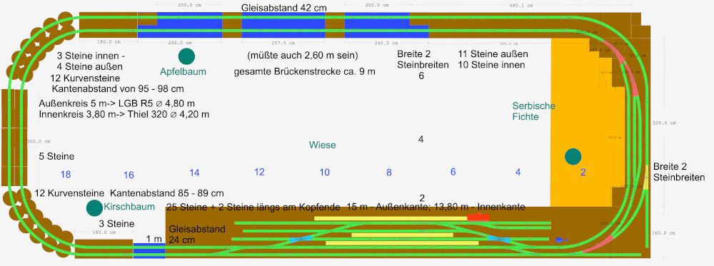 Der ursprüngliche Plan sah nur ein Aufständern der vorhandenen Anlage vor. Allerdings nach einigem Überlegen reifte dann die Idee, die Sache ganz anders anzugehen: Sollte die Anlage neu gebaut wird, dann richtig. Also stellt man dann einige Vorgaben auf, die für andere letztlich geradezu ein Traum darstellen würden. Sie sahen demzufolge wiefolgt aus: Kein Radius unter 2 m, kein Auslenkungswinkel über 15 Grad und lange Geraden, die auch lange Bahnhofsgleise mit passenden Zügen zulassen. Nach einigen Versuchen kristallisierte sich diese Lösung heraus: